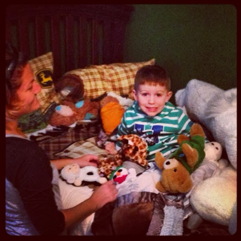 Night #1 went great in the big boy bed. He didn't fall out, he didn't get scared. He slept 12 hours, spread out with all his buddies -- caw, doggy bear, paas, bunny, corduroy, lamb ("wam"), giraffe, baby giraffe, tiny giraffe, etc. etc.